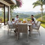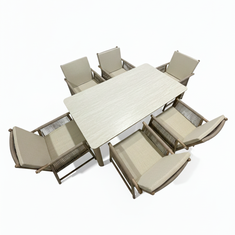 El set de comedor BOURBON evoca esa atmósfera de comunidad y celebración. Con su elegante tejido en cuerda náutica y una robusta mesa con cubierta de piedra sinterizada, este conjunto es ideal para compartir comidas al aire libre con familia y amigos.